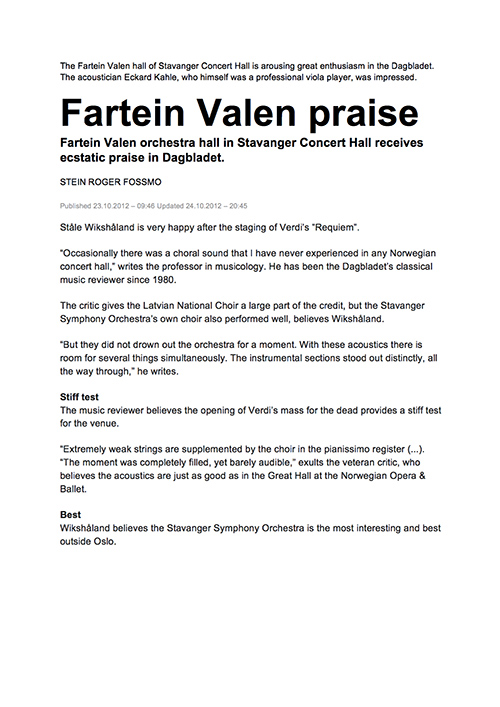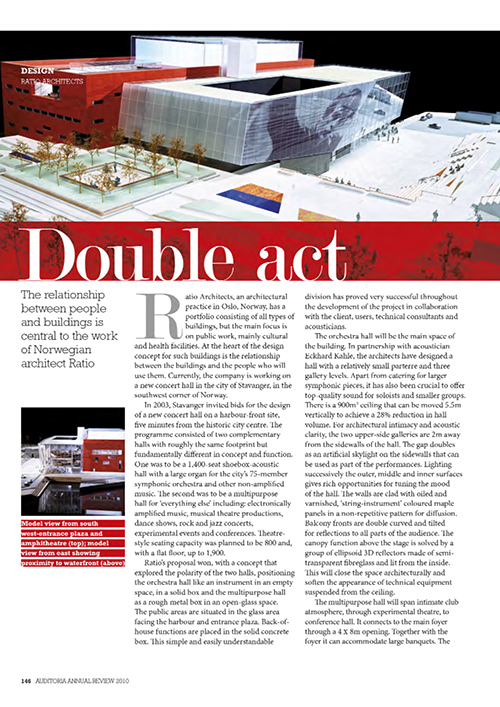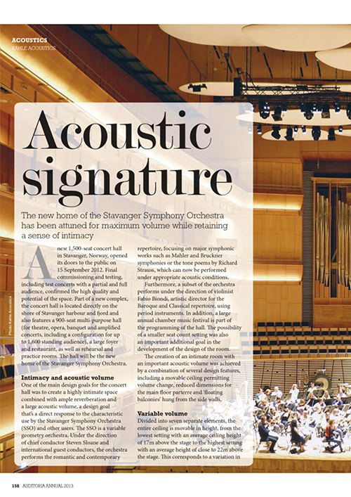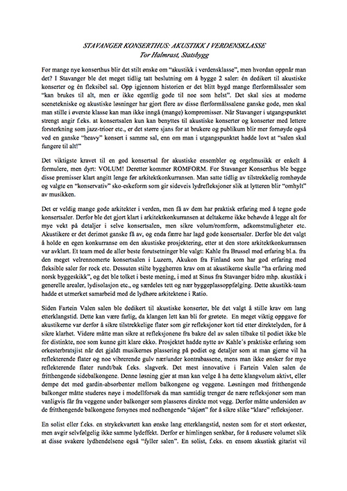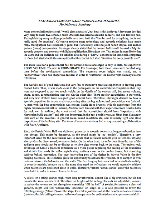 Team Eckhard Kahle, Yann Jurkiewicz, Kahle Acoustics. In collaboration with Henrik Möller, Akukon Oy, Helsinki (multi-purpose hall) and Tønnes Ognedal, Svein Folkvord, Sinus AS, Stavanger (building acoustics, local supervision and coordination).